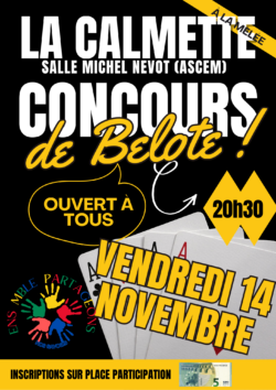 L’association « Ensemble Partageons » de La Calmette organise un concours de belote le vendredi 14 novembre à 20h30 à la salle Michel Nevot (ASCEM).